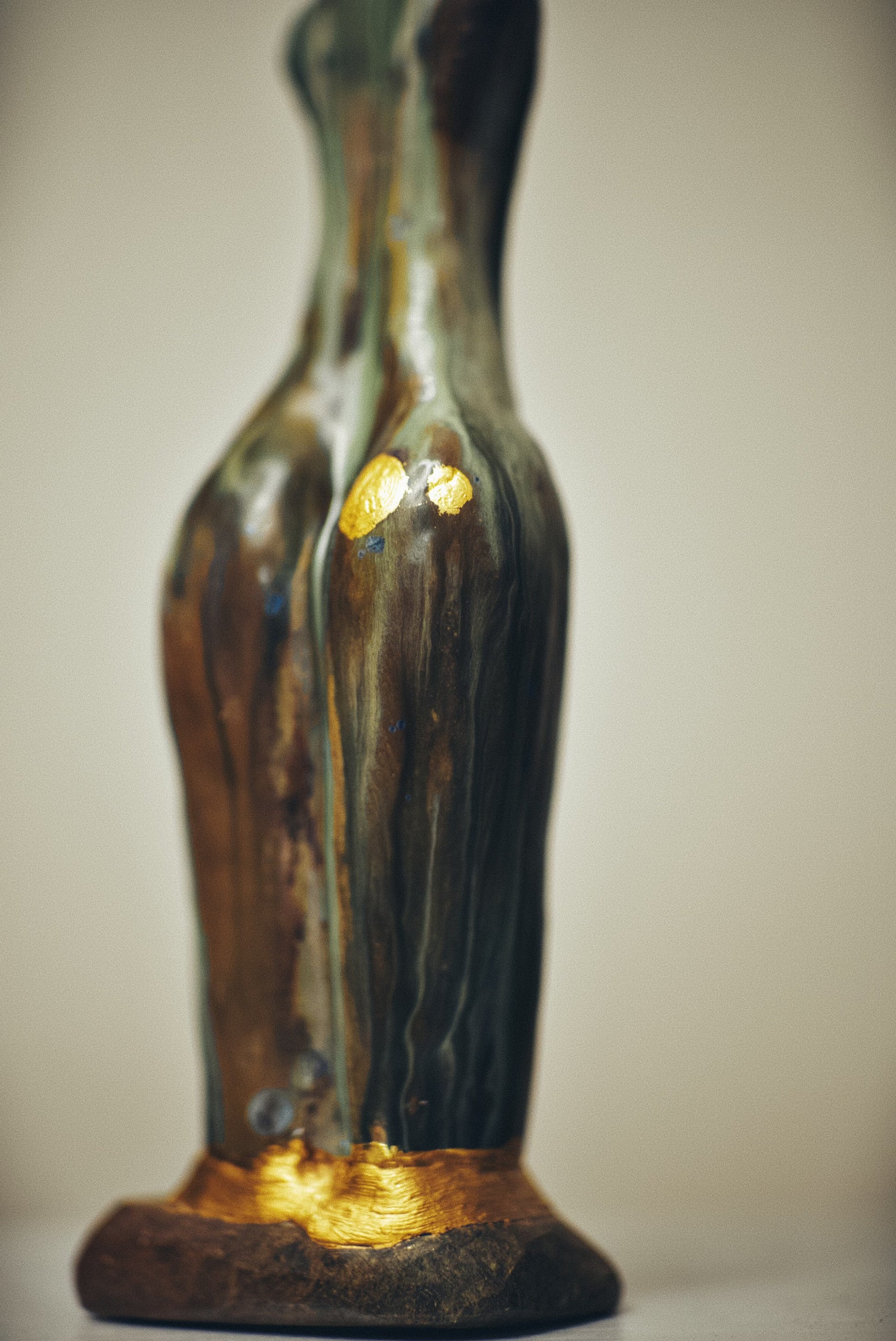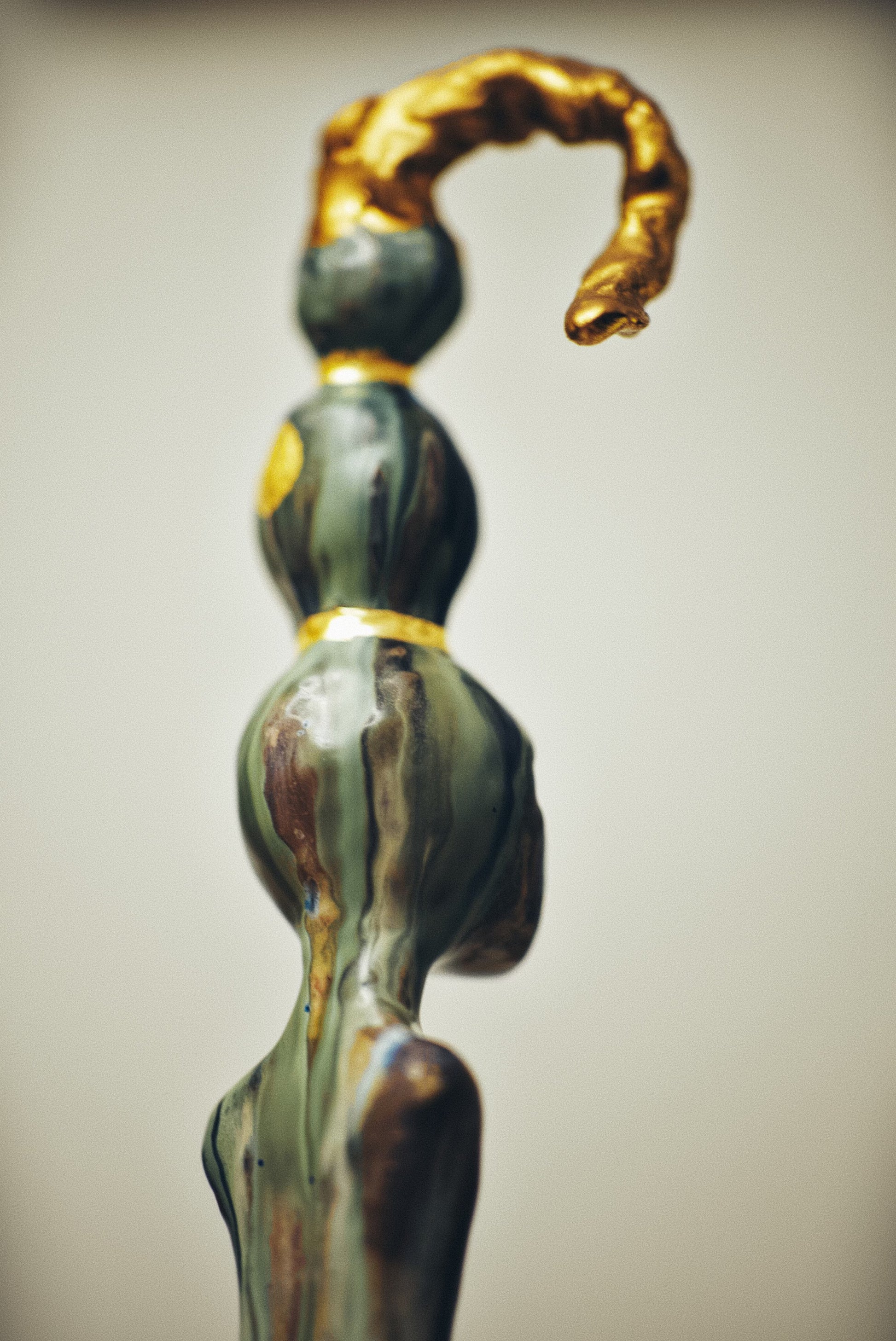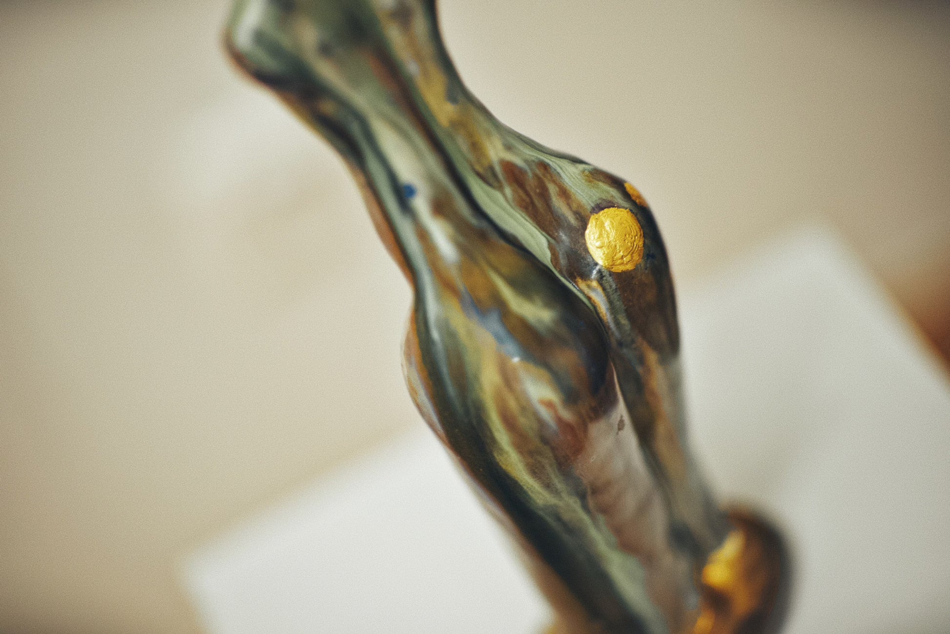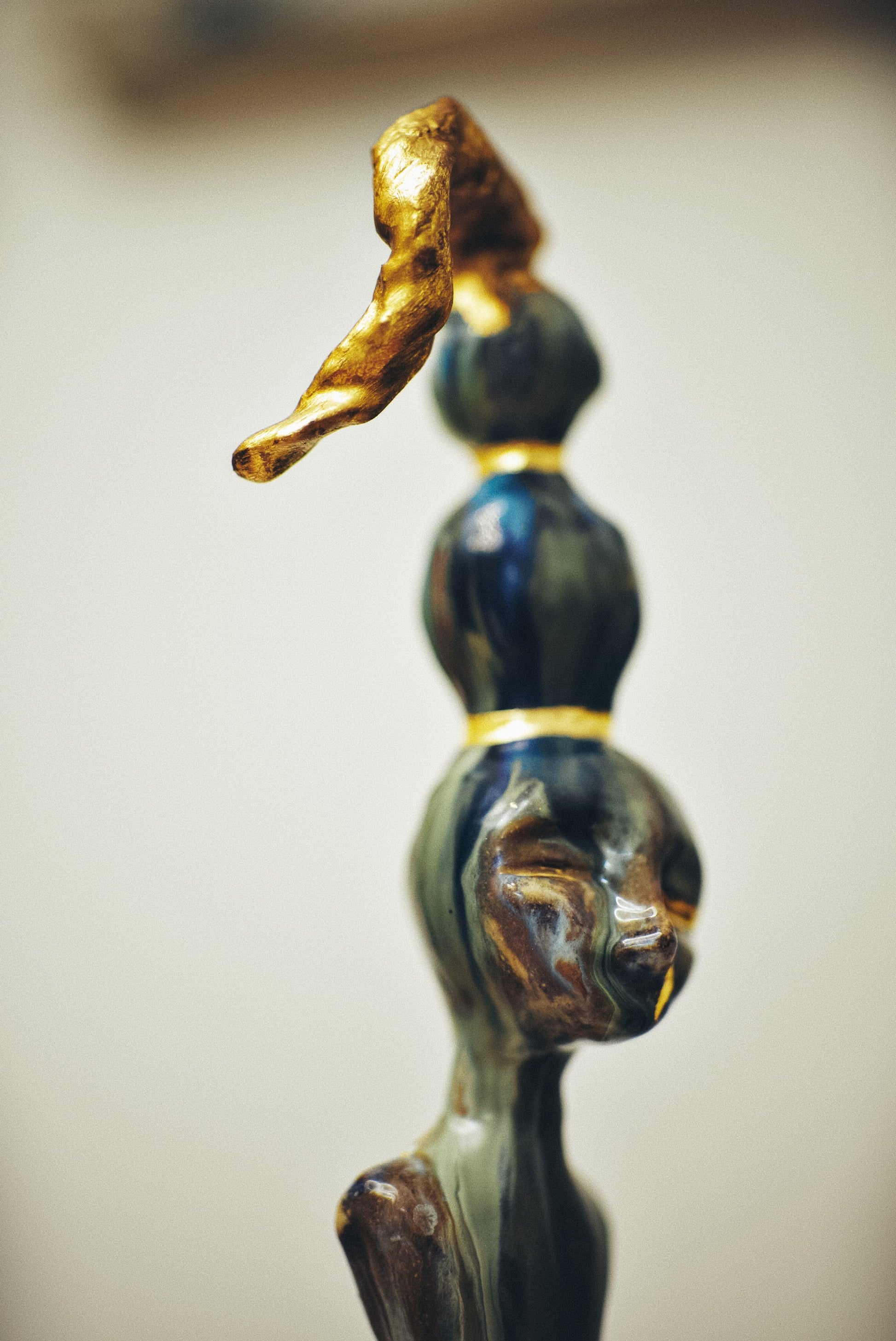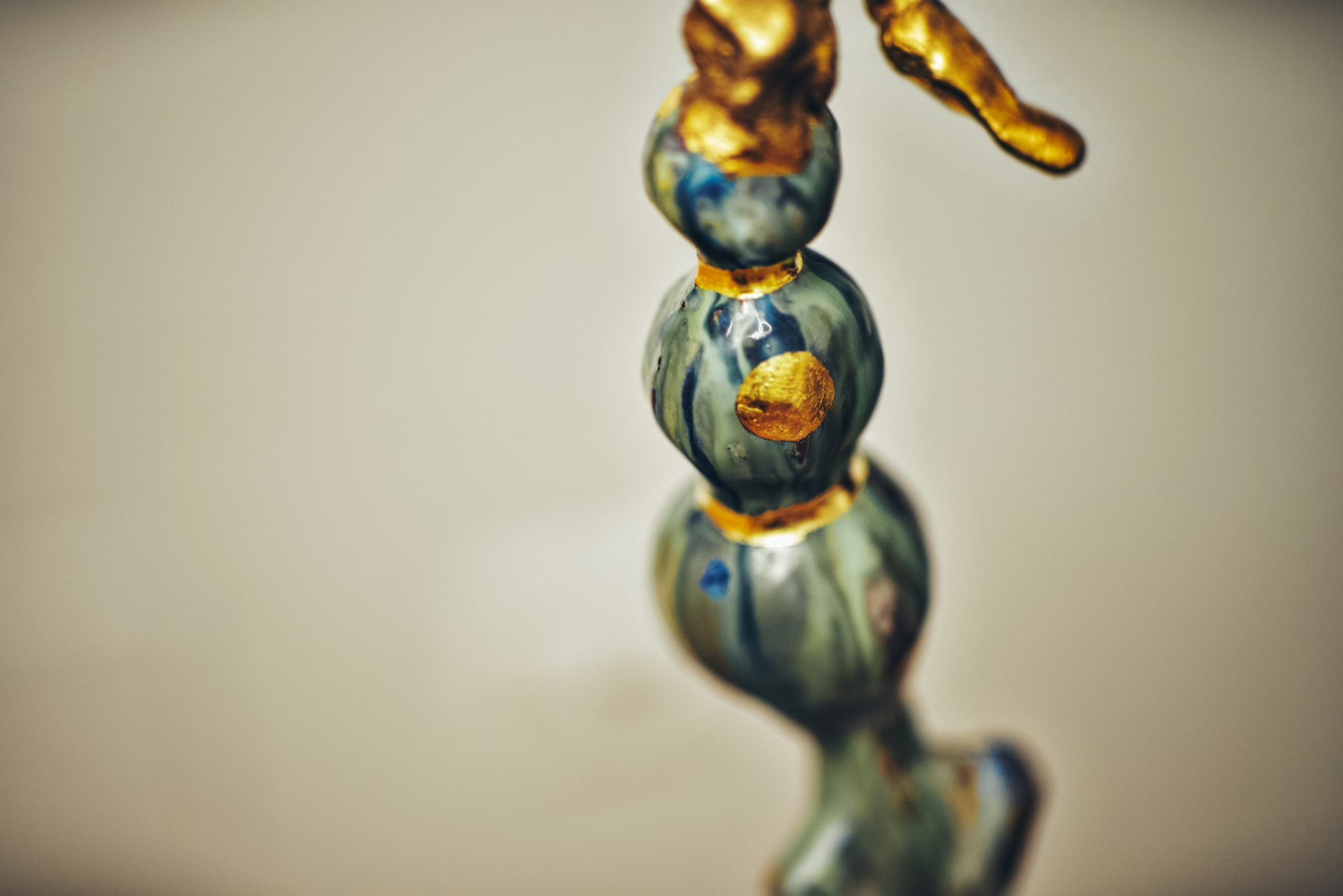 Clay with melted crystal glaze, 24kt gold, base made of steatite.