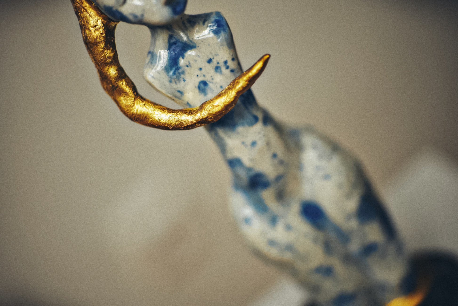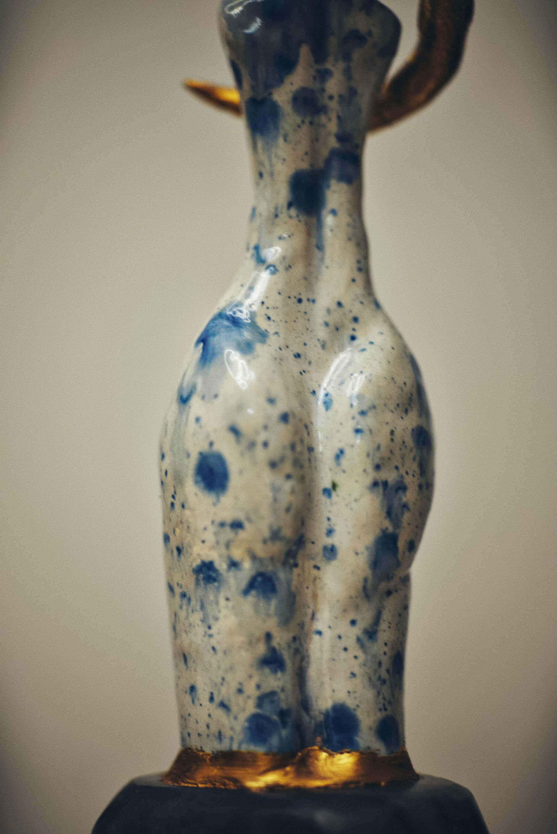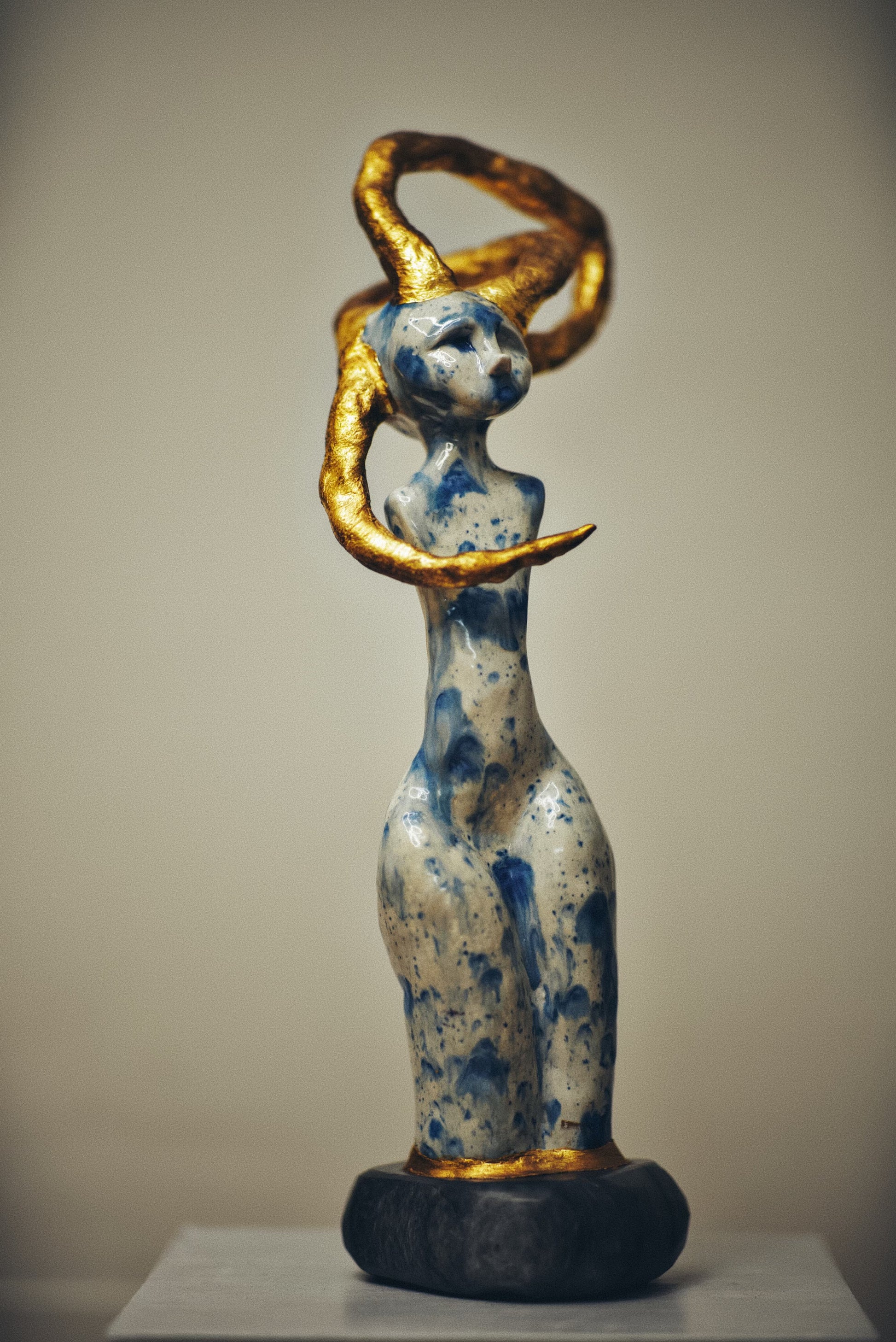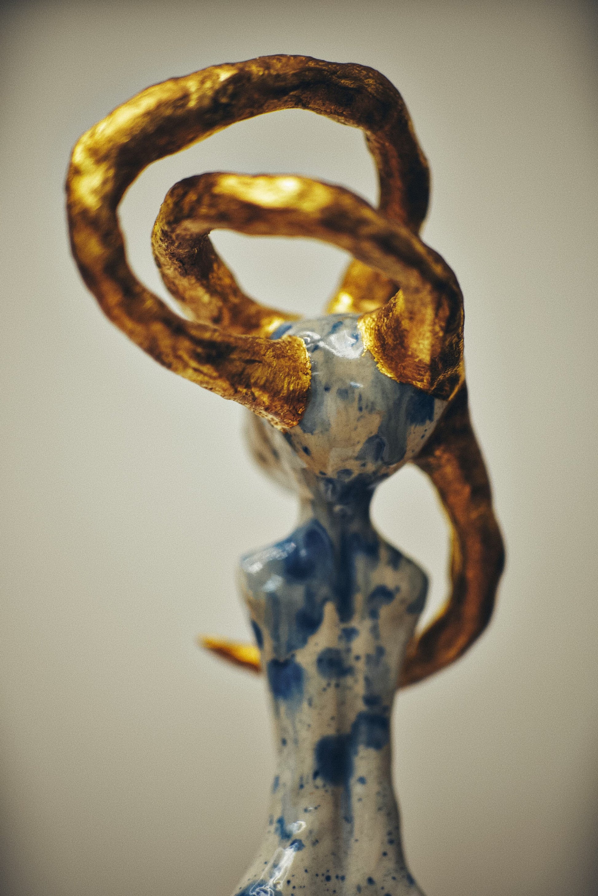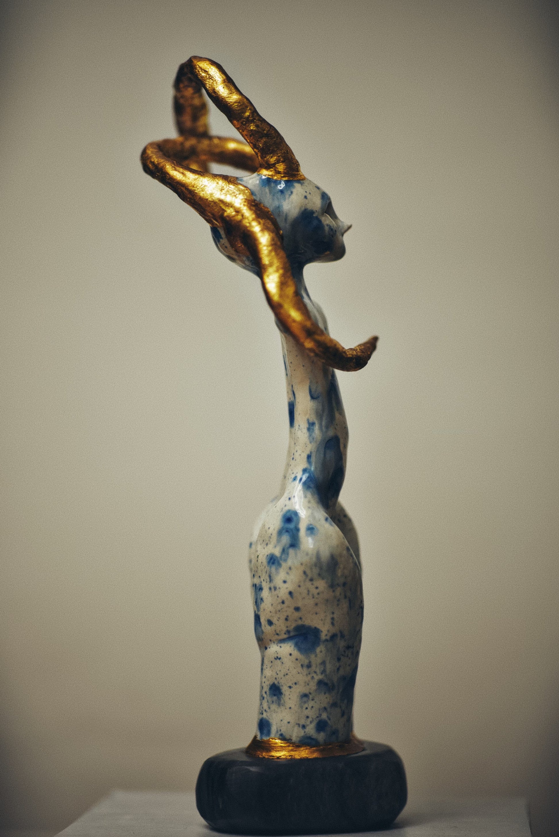 Real gold traces constellations across the surface, marking the places where dead stars have been tenderly collected and reborn. These golden eruptions appear to bloom from within the porcelain itself, as if the sculpture's core burns with solar fire. The interplay between cool blue shadows and warm golden light creates a visual storm that somehow resolves into profound peace.