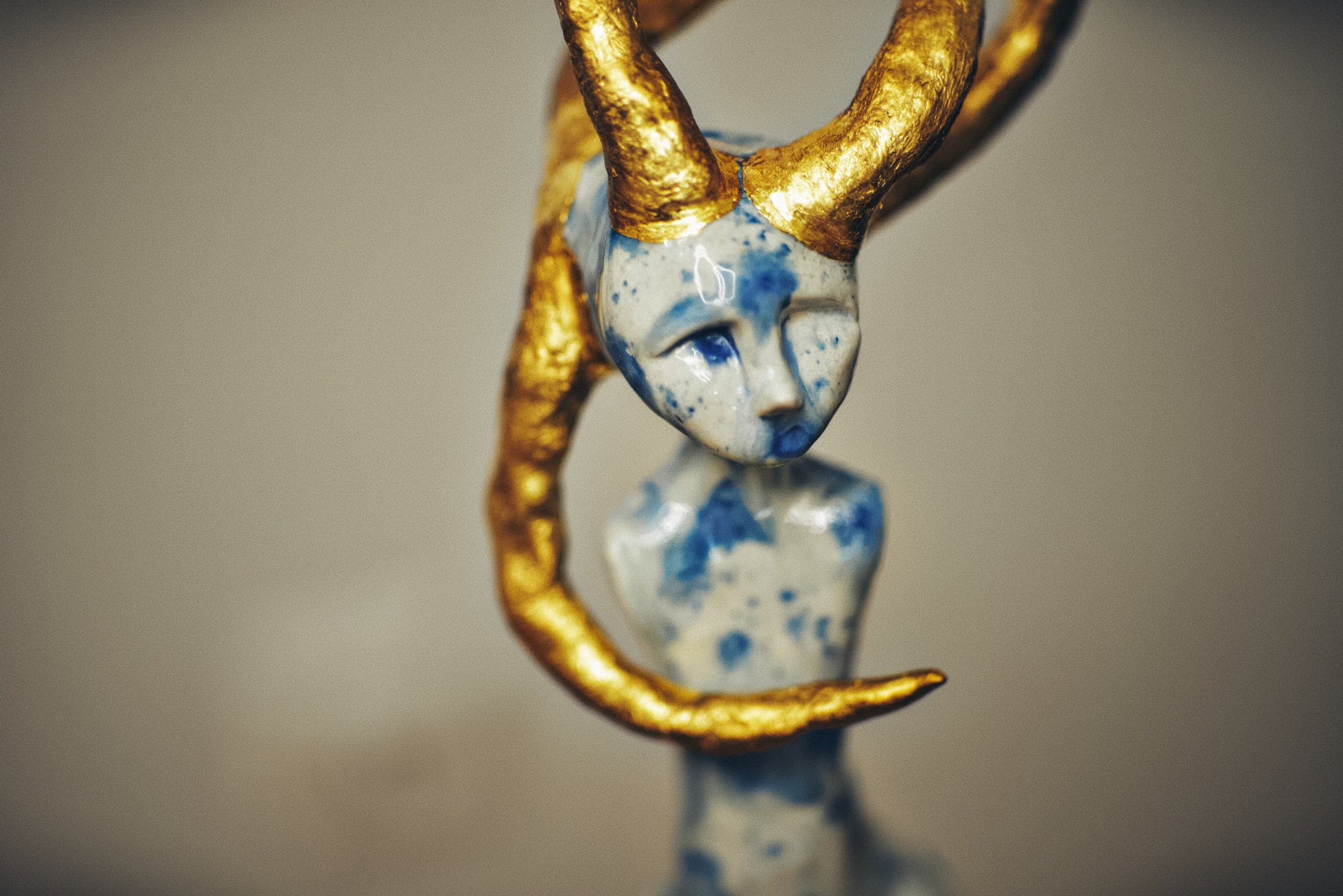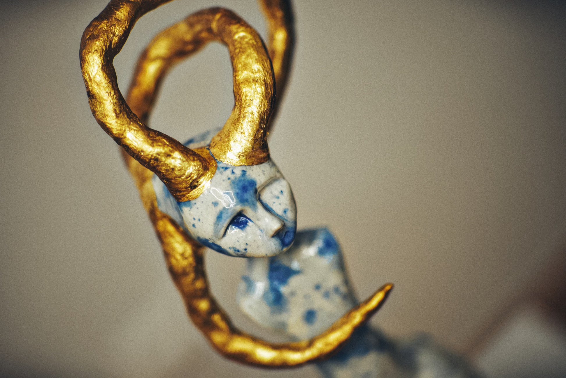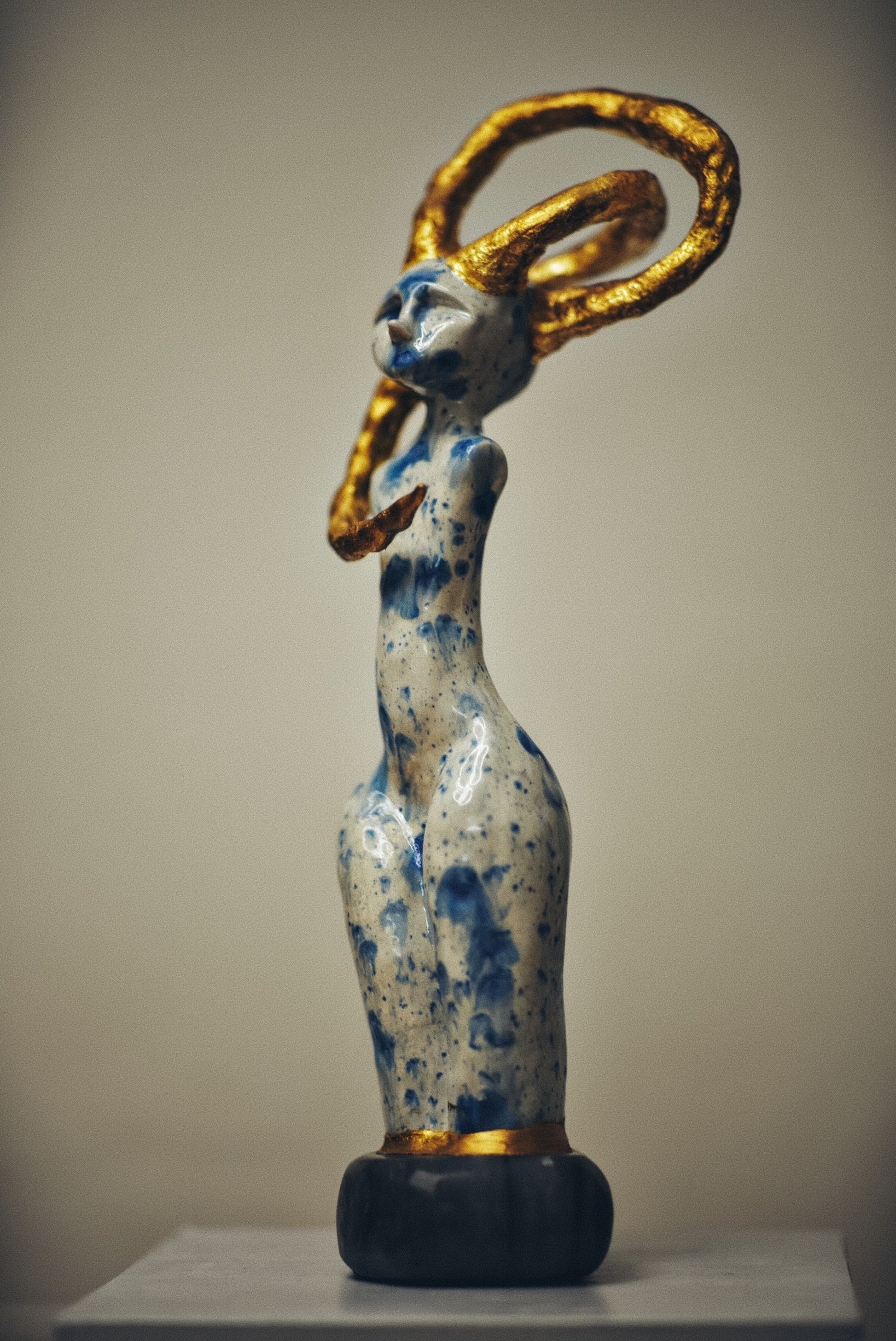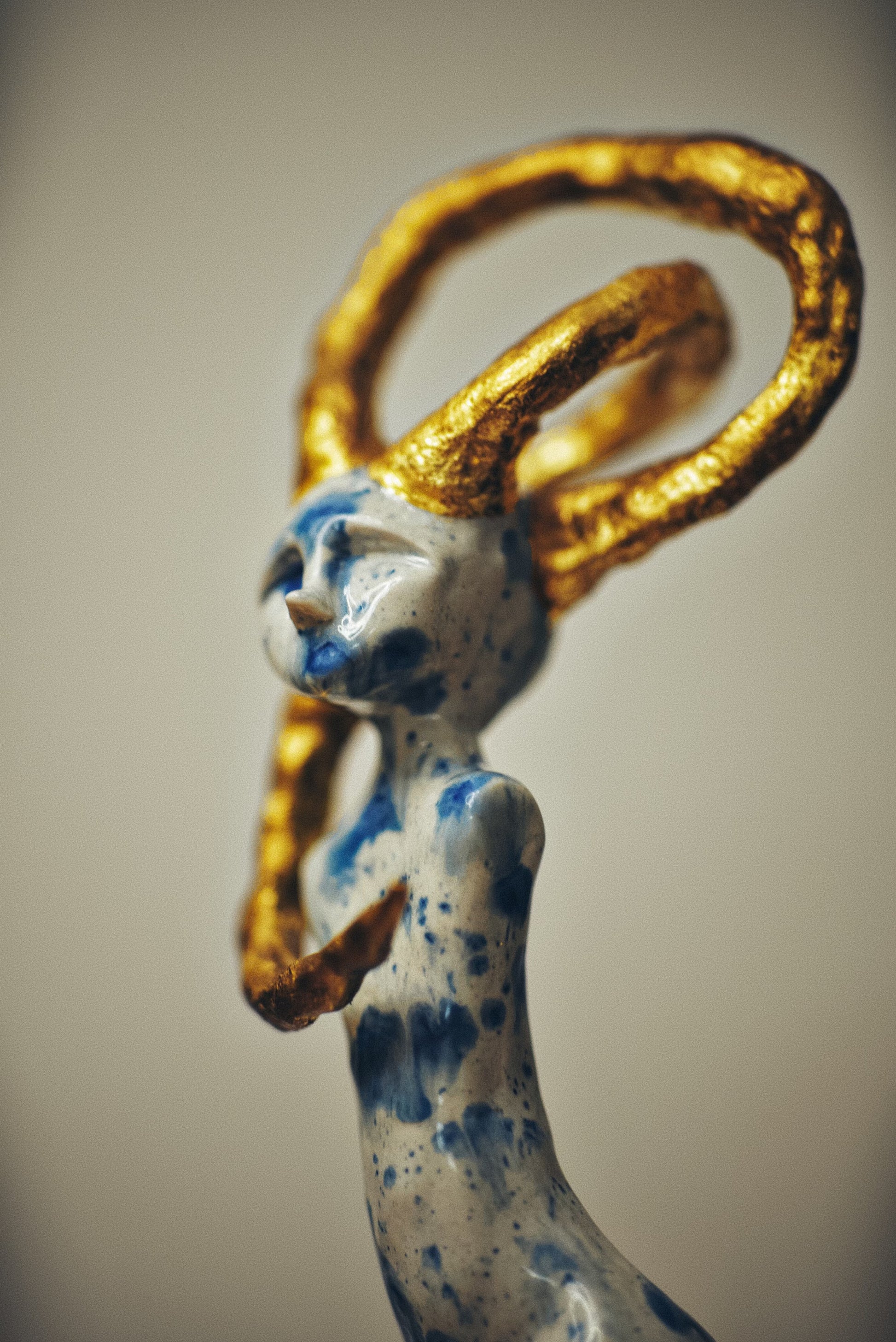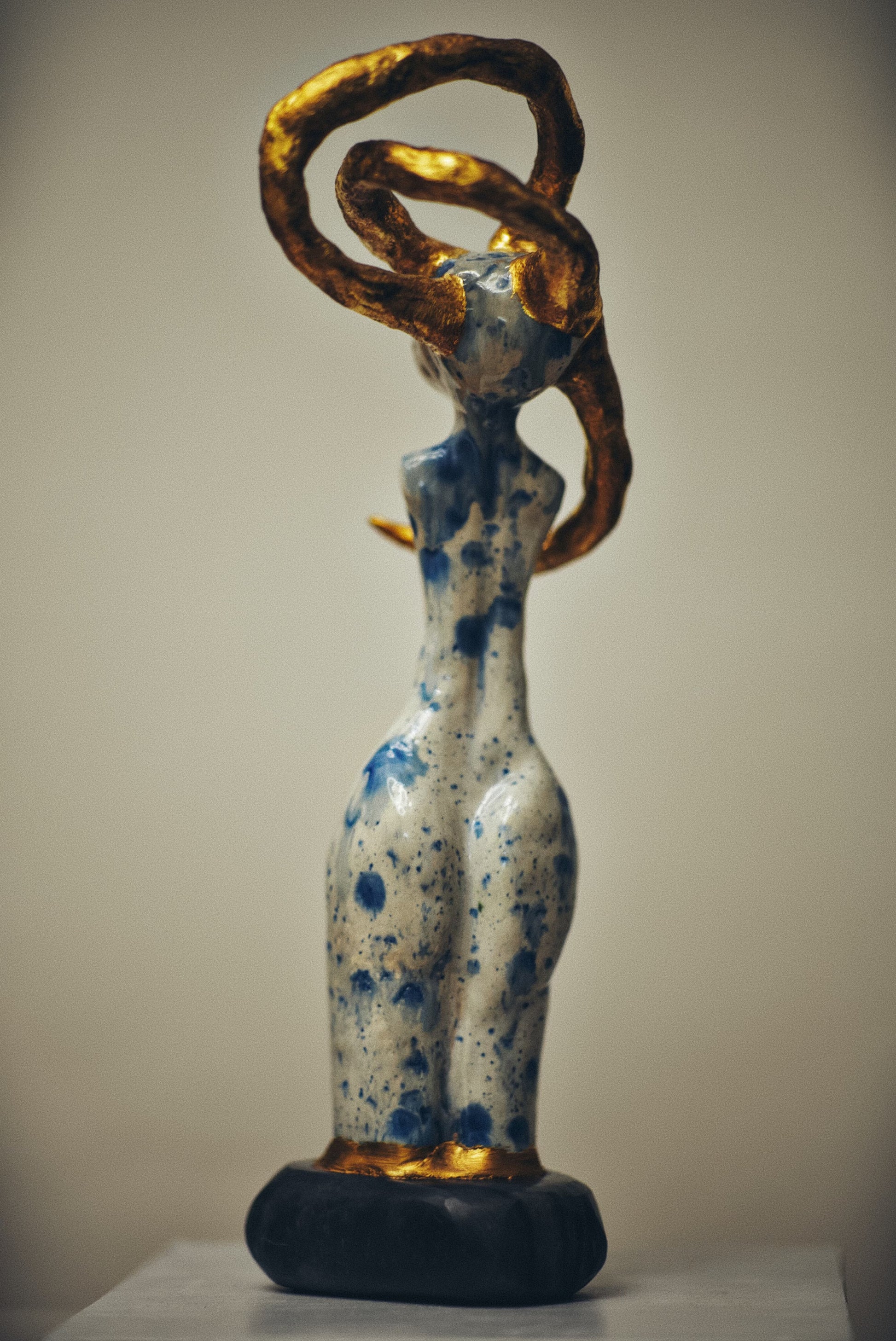 Real gold traces constellations across the surface, marking the places where dead stars have been tenderly collected and reborn. These golden eruptions appear to bloom from within the porcelain itself, as if the sculpture's core burns with solar fire. The interplay between cool blue shadows and warm golden light creates a visual storm that somehow resolves into profound peace.