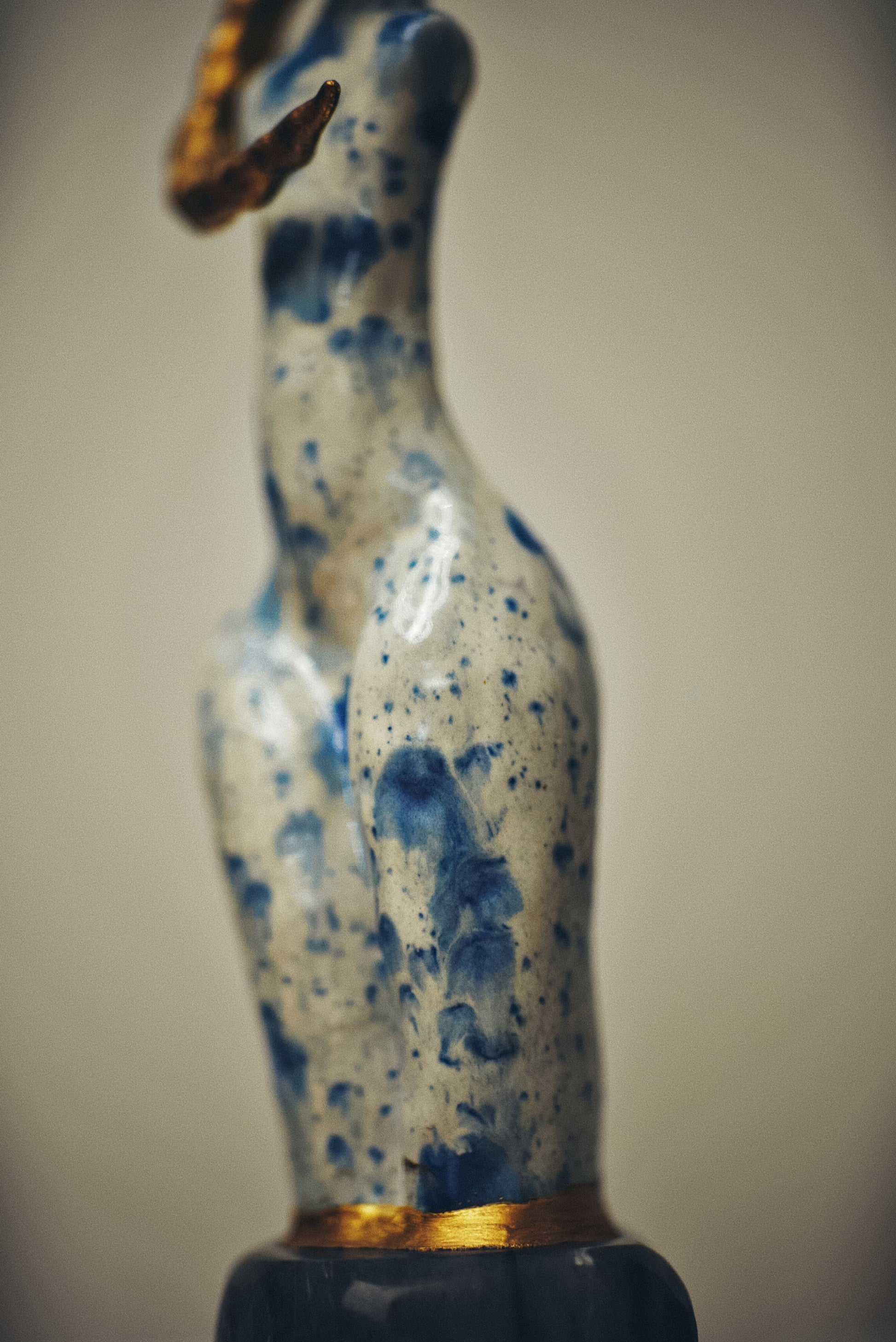 China bone porcelain with white and blue glaze, 24kt gold, base made of steatite.