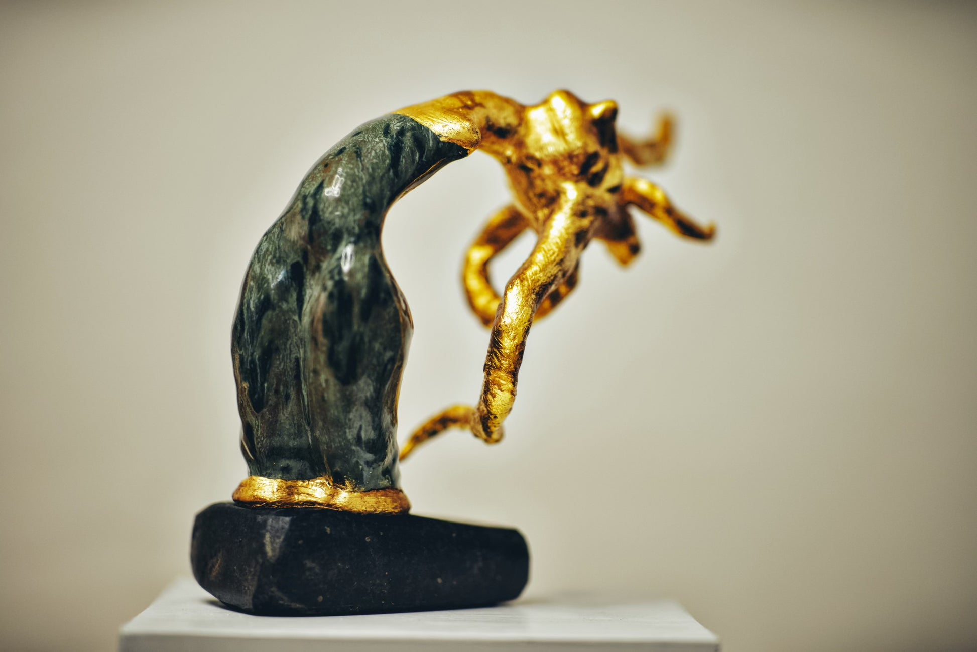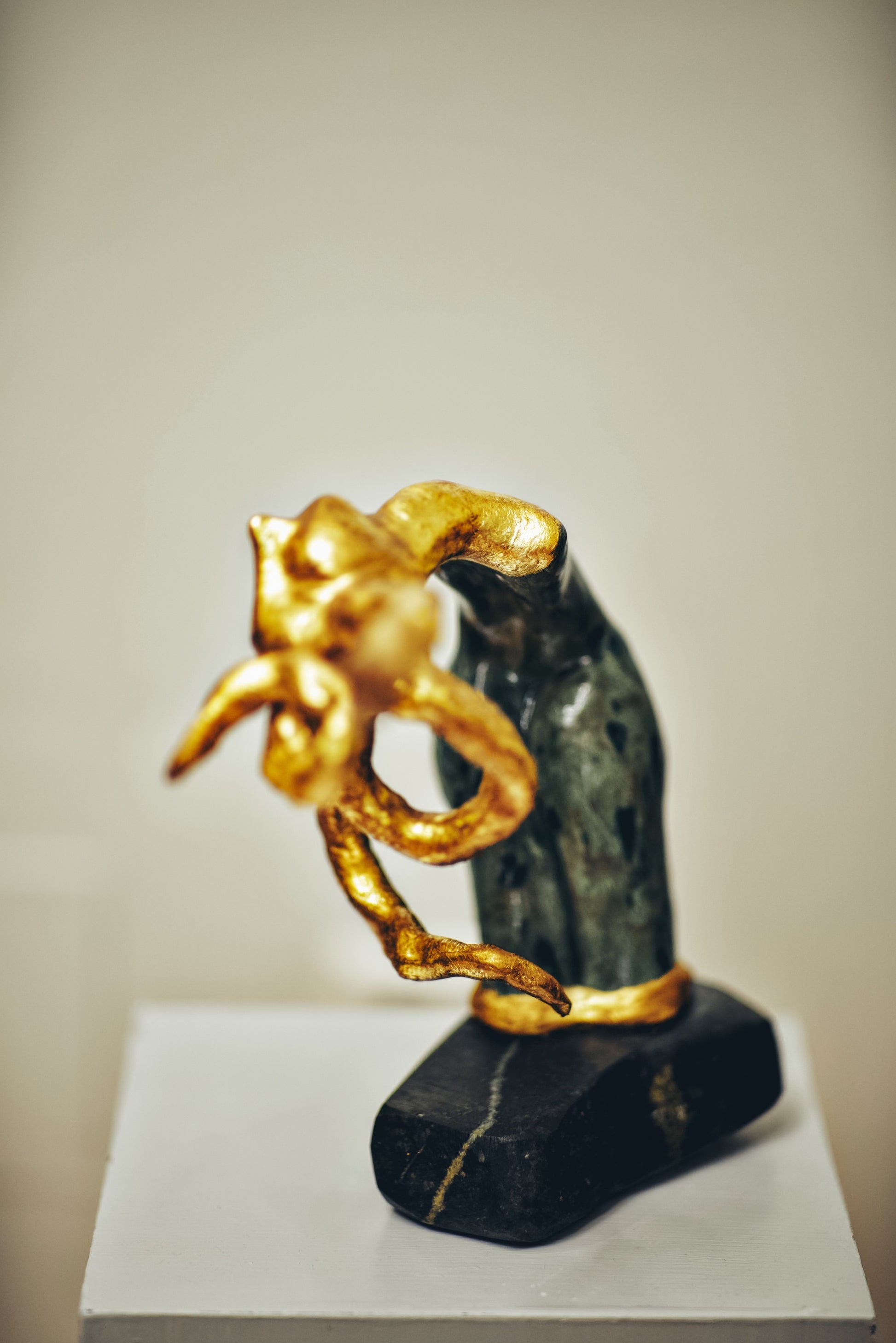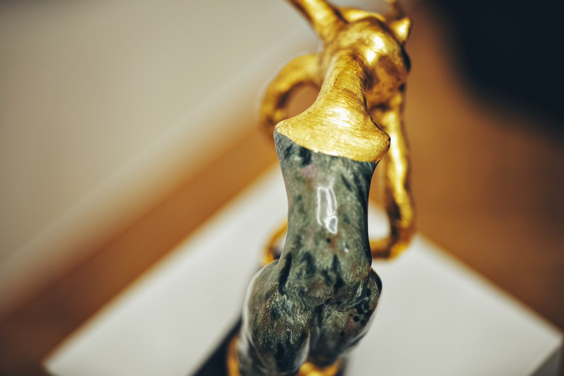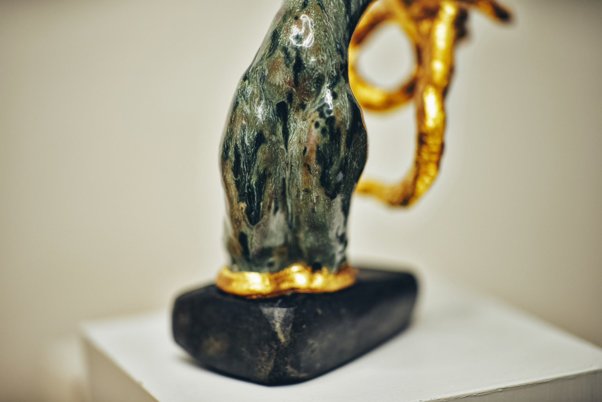 Clay with effect glaze, 24kt gold, base made of steatite.